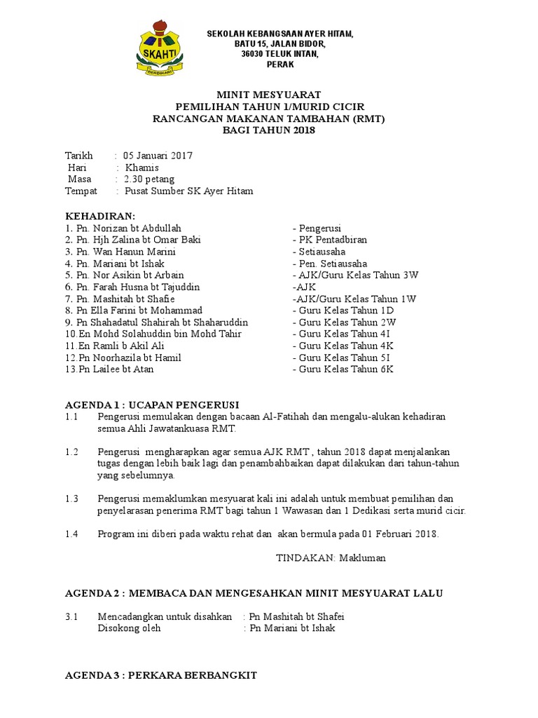 Format Minit Mesyuarat 2018 - Report minit mesyuarat rmt 2018.. Mesyuarat.آ minit mesyuarat panitia sains rumah tangga daerah kinta utara tarikh :29.03.2018 hari. Ini adalah contoh minit mesyuarat pengurusan sekolah yang mengikut format spsk mac 2012 jabatan pendidikan negeri johor darul minit mesyuarat jawatankuasa rmt bil.1/2018 sk putrajay pu trajaya a presint presin t 11(3). Antara perkara yang perlu ada dalam minit mesyuarat adalah tajuk minit mesyuarat, bil/tahun, tarikh, masa, tempat. 5 penulisan minit mesyuarat tanggungjawab menulis minit mesyuarat begitu penting dilakukan kerana merupakan satu dokumentasi, dan akan dijadikan sumber rujukan pada masa hadapan. Senarai contoh minit mesyuarat terkini :